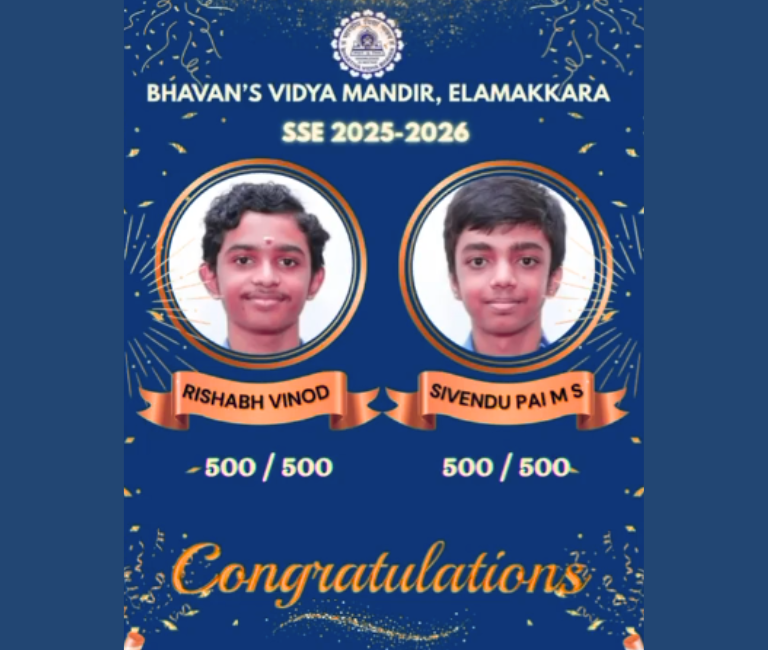 Set amidst a tranquil and serene environment, Bhavan’s Vidya Mandir, Elamakkara nurtures an ideal educational environment for students and teachers. With a perfect blend of Indian spiritual ethos and modern technology, this institution fosters a student’s quest for excellence in all spheres of life. The school is affiliated to Central Board of Secondary Education (CBSE). The CBSE affiliation number is 930016 and the school code is KL-75010.